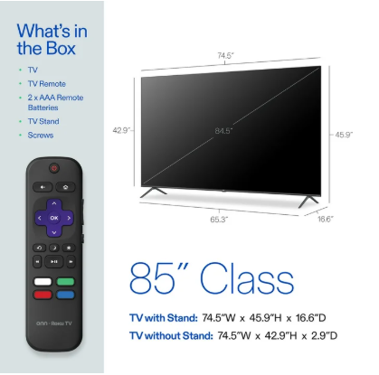 - What's in the box? 1 onn Roku TV 85”, 1 Roku TV remote control (batteries included), 1 Quick Start Guide and 1 TV stand + hardware