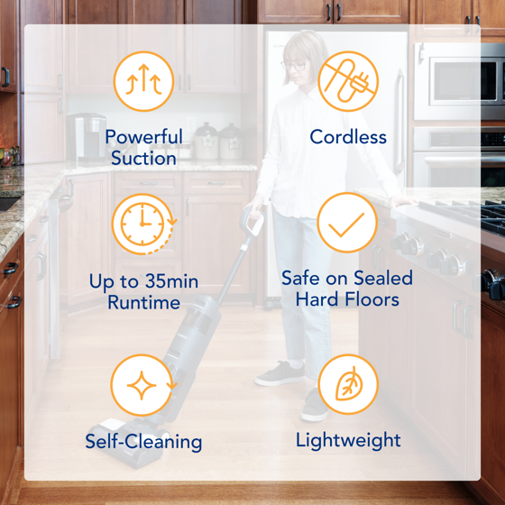 - Cordless Convenience: Experience ultimate floor washing freedom with up to 35 minutes of uninterrupted cleaning time to reach every corner of your home