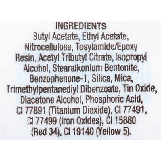 Ethyl Acetate, Butyl Acetate, Nitrocellulose, Propyl Acetate, Tosylamide/Formaldehyde Resin, Isopropyl Alcohol, Trimethyl Pentanyl Disobutyrate, Triphenyl Phosphate, Ethyl Tosylamide, Camphor, Stearalkonium Bentonite, Diacetone Alcohol, Stearalkonium Hectorite, Benzophenone-1, Citric Acid, Dimethicone, Mica, Cl 77510, Cl 47000, BCC12-Base