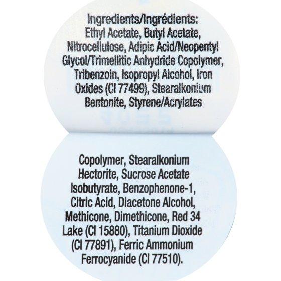 Ethyl Acetate, Butyl Acetate, Nitrocellulose, Propyl Acetate, Tosylamide Formaldehyde Resin, Isopropyl Alcohol, Trimethyl Pentanyl Diisobutyrate, Triphenyl Phosphate, Ethyl Tosylamide, Camphor, Stearalkonium Bentonite, Diacetone Alcohol, Stearalkonium Hectorite, Benzophenone 1, Citric Acid, Dimethicone, CI 77120, Titanium Dioxide (CI 77891), CI 77499, FD&C Yellow 5 Aluminum Lake, FD&C Red 6.