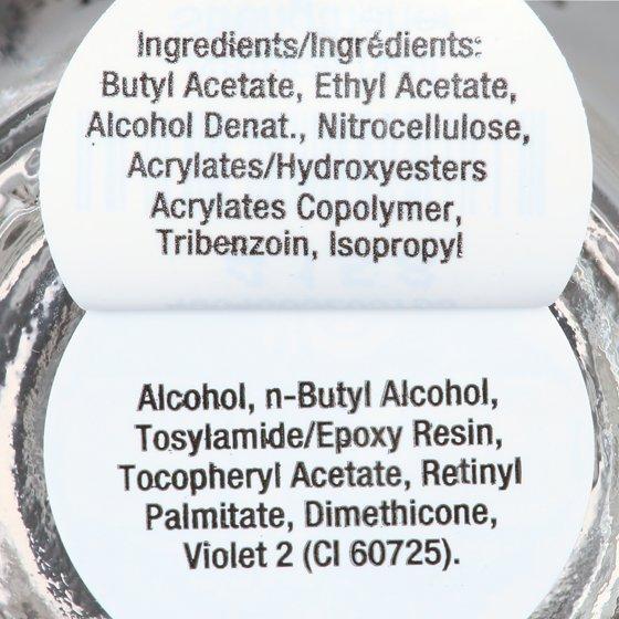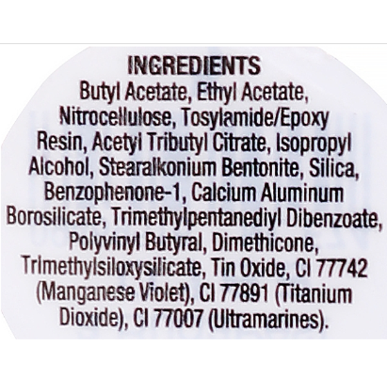Ethyl Acetate, Butyl Acetate, Alcohol Denat./SD Alcohol 40-B, Nitrocellulose, Isopropyl Alcohol, Tosylamide/Formaldehyde Resin, Triphenyl Phosphate, Trimethyl Pentanyl Diisobutyrate, n-Butyl Alcohol, Camphor, Benzophenone-1, Dimethicone, CI 60725 (Violet 2).