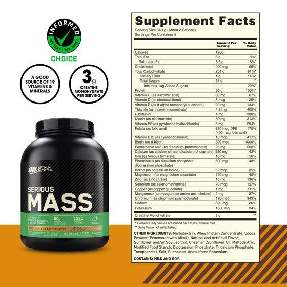 - Optimum Nutrition, Serious Mass, 50g Protein Powder with Whey Protein & Creatine Monohydrate, Chocolate Peanut Butter, 6 lb, 8 Servings