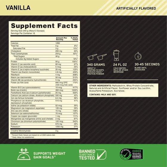 Optimum Nutrition Serious Mass Vanilla Weight Gain Protein Powder | 12 lbs