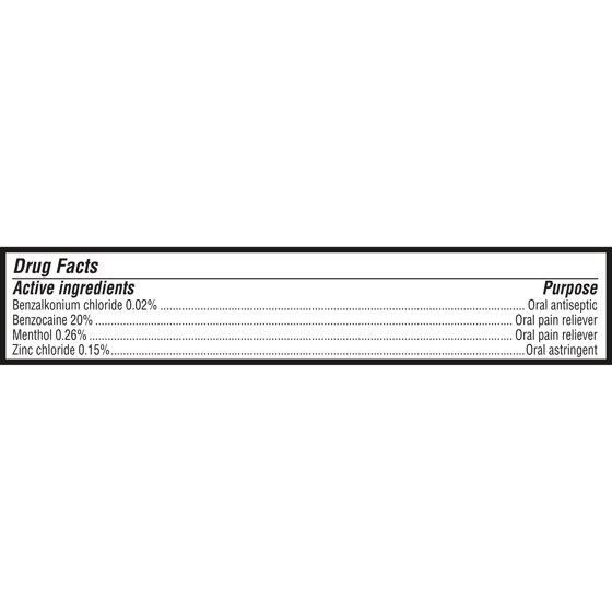 Active Ingredients: Benzalkonium Chloride (0.02 %), Oral Antiseptic; Benzocaine (20 %), Oral Pain Reliever; Menthol (0.26 %), Oral Pain Reliever; Zinc Chloride (0.15 %), Oral Astringent. Inactive Ingredients: Ammonium Glycyrrhizate, Flavor, PEG-8, PEG-75, Raspberry Ketone, Sodium Saccharin, Sorbic Acid, Titanium Dioxide, Water.