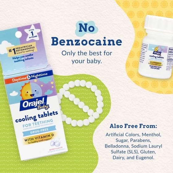 - FREE FROM: Cooling Tablets are free from Benzocaine, as well as free from artificial colors and sweeteners, menthol, preservatives, parabens, belladonna, sodium lauryl sulfate, gluten, and dairy