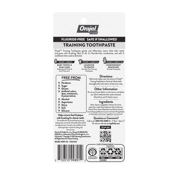 - FLUORIDE-FREE TRAINING TOOTHPASTE: Fluoride-free formula is safe if swallowed when used as directed