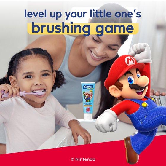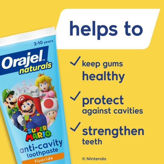 - 5.8 oz tube of Orajel Naturals Super Mario Anti-Cavity Toothpaste, a fluoride toothpaste for kids ages 2-10 that levels up their brushing game