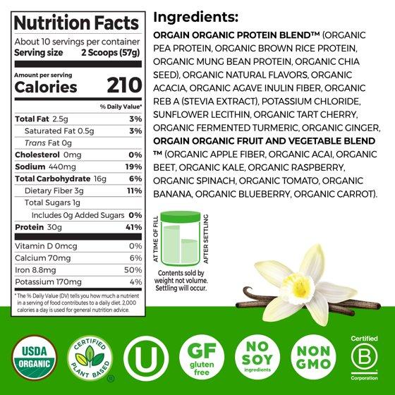Orgain Organic Protein Blend™ (Organic Pea Protein, Organic Brown Rice Protein, Organic Mung Bean Protein, Organic Chia Seed), Organic Natural Flavors, Organic Acacia, Organic Agave Inulin Fiber, Organic Reb A (Stevia Extract), Potassium Chloride, Sunflower Lecithin, Organic Tart Cherry, Organic Fermented Turmeric, Organic Ginger, Orgain Organic Fruit And Vegetable Blend™ (Organic Apple Fiber, Organic Acai, Organic Beet, Organic Kale, Organic Raspberry, Organic Spinach, Organic Tomato, Organic Banana, Organic Blueberry, Organic Carrot).