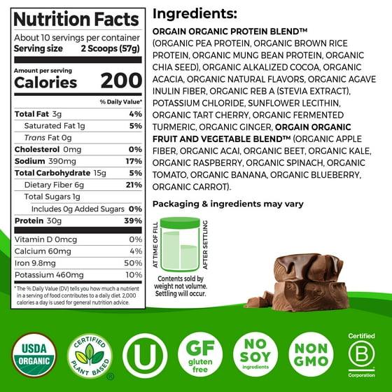 Orgain Organic Protein Blend™ (Organic Pea Protein, Organic Brown Rice Protein, Organic Mung Bean Protein, Organic Chia Seed), Organic Alkalized Cocoa, Organic Acacia, Organic Natural Flavors, Organic Agave Inulin Fiber, Organic Reb A (Stevia Extract), Potassium Chloride, Sunflower Lecithin, Organic Tart Cherry, Organic Fermented Turmeric, Organic Ginger, Orgain Organic Fruit And Vegetable Blend™ (Organic Apple Fiber, Organic Acai, Organic Beet, Organic Kale, Organic Raspberry, Organic Spinach, Organic Tomato, Organic Banana, Organic Blueberry, Organic Carrot).