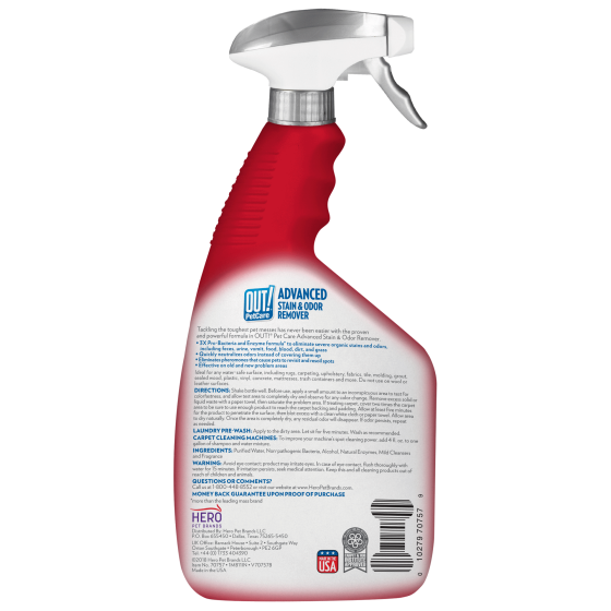 OUT! PetCare's Pro Bacteria and Enzyme formula eliminates severe organic stains and odors, including dog and cat feces and urine, vomit, food, blood, dirt, and grass. Quickly neutralizes odors instead of covering them up and the fresh scent leaves your carpets smelling and looking great. Eliminates pheromones that cause pets to revisit and re-soil spots. Effective on old and new problem areas Carpets, Upholstery, Bedding, Clothing, and Water-Safe Surfaces.