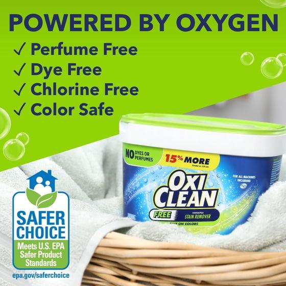 - Dye-free, perfume-free OxiClean powder laundry booster removes everyday dirt and tough set-in stains from machine-washable t-shirts, sheets, towels, shoes, hats, workout gear, and kids’ and baby clothes