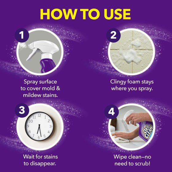Use On: Grout, tile, tubs, shower doors and vinyl curtains, sinks, counters and no-wax floors. Directions: Work in a well ventilated area. Avoid prolonged breathing of vapors. If vapors bother you, leave the room while product cleans. Do not mix with toilet bowl cleaners, acidic cleaners, ammonia or any other products as toxic fumes may result. Household gloves are recommended for sensitive skin or prolonged use. 1. Turn nozzle to foam position. 2. Spray surface to cover mold and mildew stains. Clingy foam stays where you spray to help make cleaning easier. Wait for stains to disappear. 3. Wipe with wet sponge or doth. 4. Heavy mold and mildew stain buildup may require longer contact time or additional application. Rinse immediately after use on metal or porcelain to avoid pitting or discoloration.