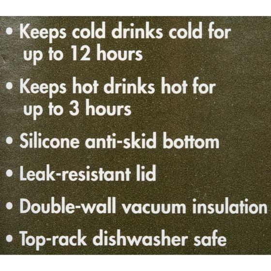 - Double-wall vacuum insulation keeps drinks cold for up to 12 hours or hot for up to 3 hours