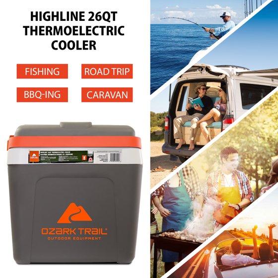 Ozark Trail 26QT electric Cooler 12V Portable Travel Beach Camping Picnic Insulated Cooler 30 Cans Iceless 24L, Grey