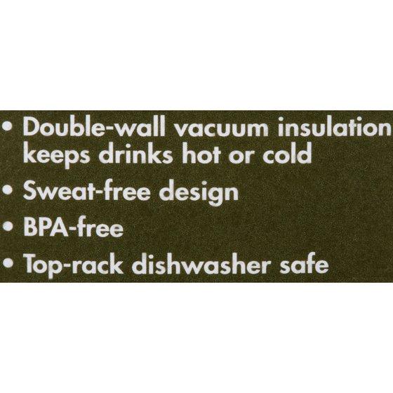- Double-wall vacuum insulation keeps drinks hot or cold for hours