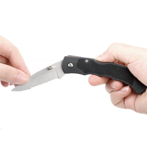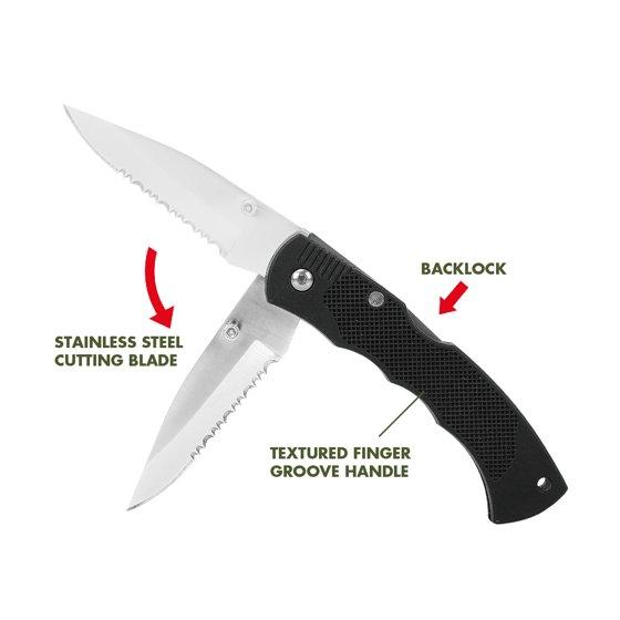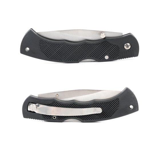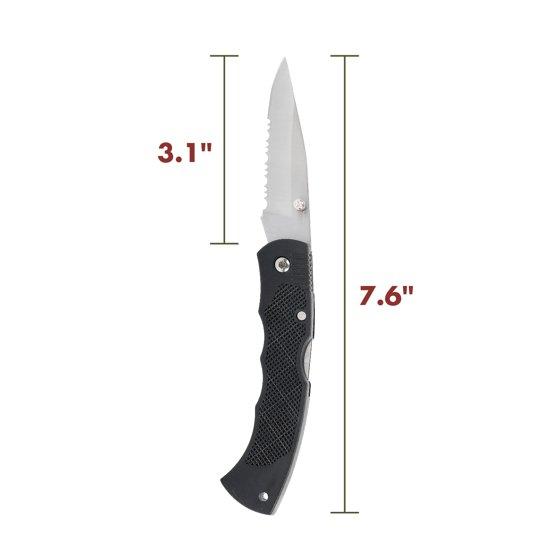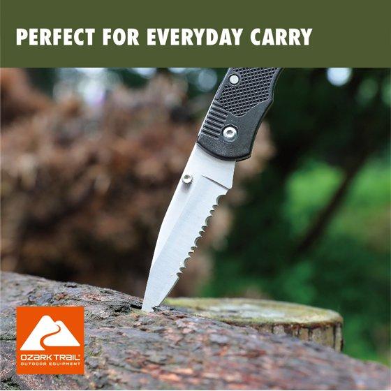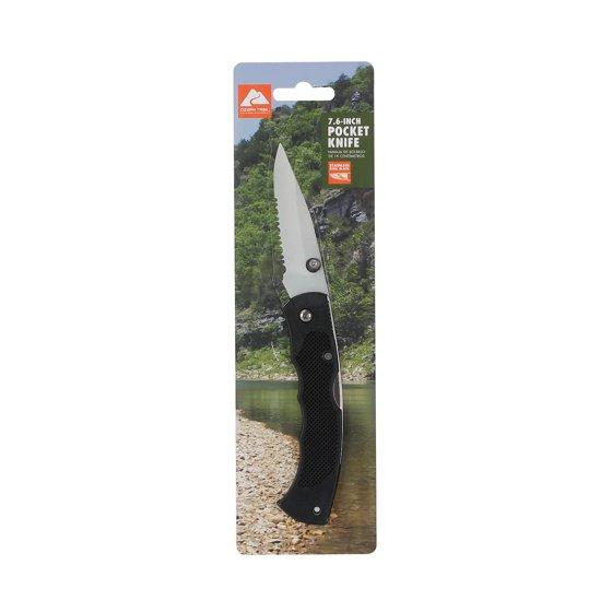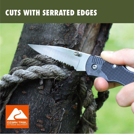 The Ozark Trail 7.6-inch Pocket Knife can cut through rope, vegetation and other materials while on camping trips and other expeditions. The 3.1 inch stainless steel blade has a sharp point and a serrated edge for penetration and powerful, smooth cutting action. It also folds into the handle for safe carrying and features a clip for attaching to a pocket and making access quick and easy. Open the blade fast with the thumb stud. The handle of this folding pocket knife has a textured surface and a curved shape to provide a comfortable, secure grip. Ozark Trail pocket knife is a good choice for you.