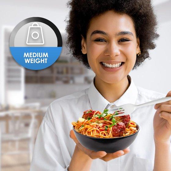 You can trust these plastic forks to handle all types of foods without bending, breaking, or causing any annoyance. They are ideal for any course, from salads and fruits to meat dishes, pasta, and desserts, ensuring you can enjoy your meals with the utmost comfort.