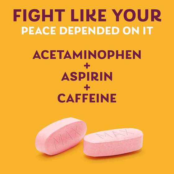 Active Ingredients: Acetaminophen 250 mg., Aspirin 250 mg., Caffeine 65 mg. Inactive Ingredients: Fractionated Coconut Oil, Hypromellose, Maltodextrin, Microcrystalline Cellulose, Polydextrose, Polyvinylpyrrolidone, Pregelatinized Starch, Red 27 Lake, Red 40 Lake, Silica, Starch, Stearic Acid, Talc, Ti