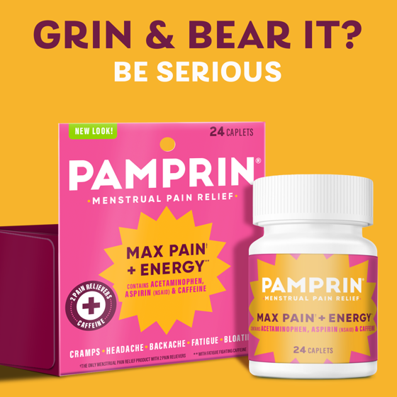 Pamprin Max Pain + Energy Caplets is powerfully formulated to fight the worst of your period pain and give you the boost of energy you need. Pamprin Max Pain + Energy is the only menstrual pain product with two pain relievers – aspirin and acetaminophen – while fighting fatigue, bloating and water weight gain with caffeine. Pamprin Max Pain + Energy offers complete coverage for PMS symptoms for adults and teenagers.
