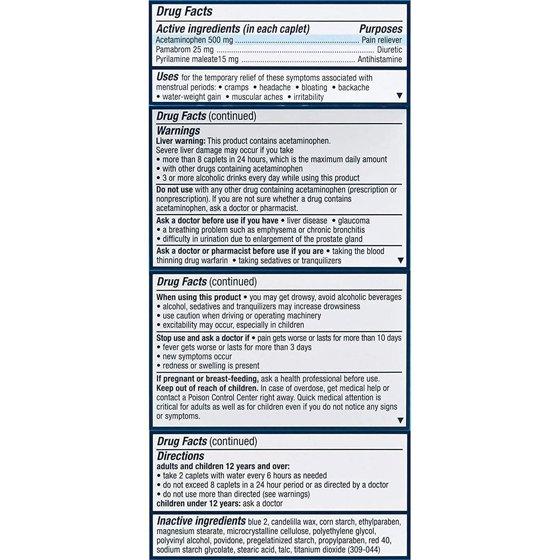 Acetaminophen 500 mg (Pain Reliever), Pamabrom 25 mg (Diuretic), Pyrilamine Maleate 15 mg (Antihistamine)