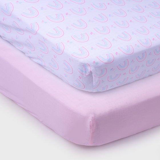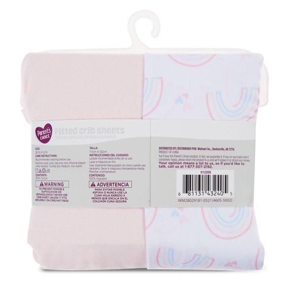 Give your baby a good night's sleep with Parent's Choice Fitted Crib Sheets. These sheets are 200 thread count, 100 percent cotton, and have a lovely soft finish, perfect for delicate skin. The package contains two fitted sheets designed to fit a 28-inch by 52-inch crib mattress. This adorable sheet set consists of a soft multi-colored rainbow design with sweethearts and a matching sheet in soft pink. We had this product independently certified with standard 100 by OEKO-TEX so that you don't have to worry about harmful substances in your baby's bedding. Your little one will drift peacefully off to slumber with Parent's Choice Fitted Crib Sheets.
