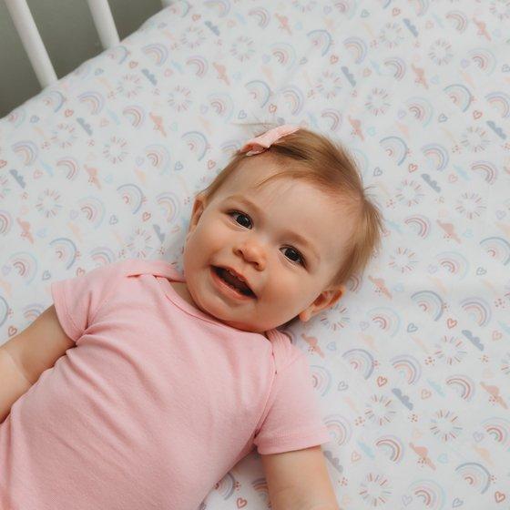 Parent's Choice Fitted Crib Sheets, Purple Rainbow, 2 Pack provide soft comfort and a secure fit for your baby’s crib. Made from 100% polyester, these sheets are designed to fit standard crib mattresses measuring 28 in x 52 in (71.1 cm x 132.1 cm). The set includes one solid purple sheet and one with cheerful rainbow patterns to brighten the nursery. Each sheet features elastic edges for a snug, stay-put fit and is machine washable for easy care. Parent's Choice Fitted Crib Sheets, Purple Rainbow, 2 Pack blend style, softness, and practicality.