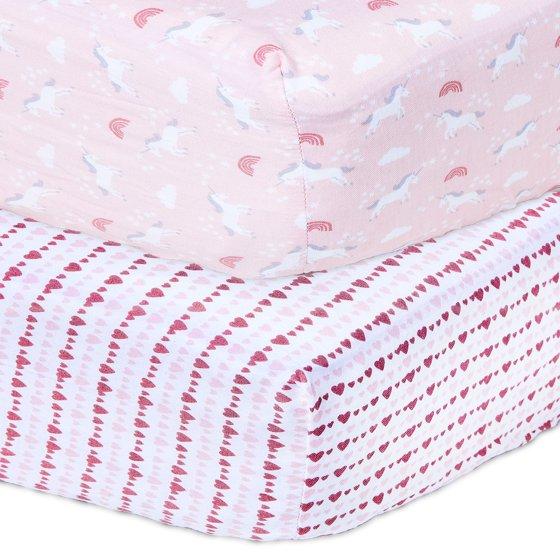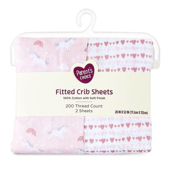 Parent's Choice 2-Pack Cotton Fitted Crib Sheets for Baby Girls Crib Bed, Unicorn, Pink
