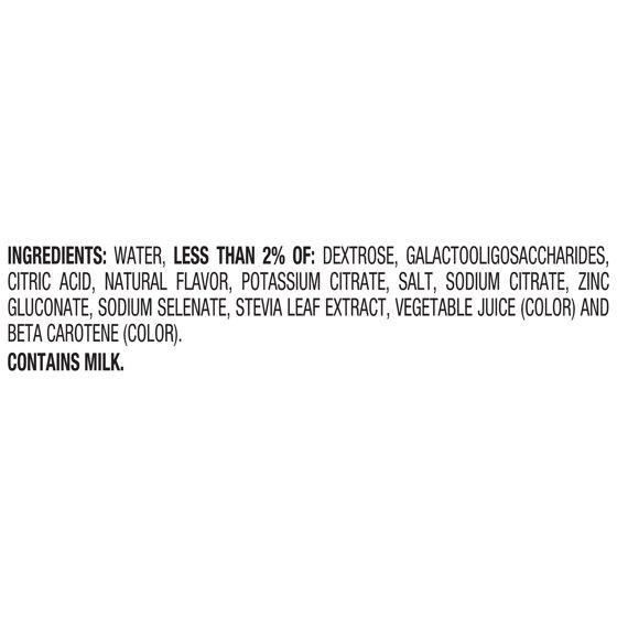 Ingredients: Water, less than 2% of: dextrose, galactooligosaccharides, citric acid, natural flavor, potassium citrate, salt, sodium citrate, zinc gluconate, stevia leaf extract, vegetable juice (color) and beta carotene (color). Contains milk. Contains bioengineered food ingredients.