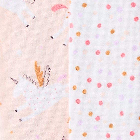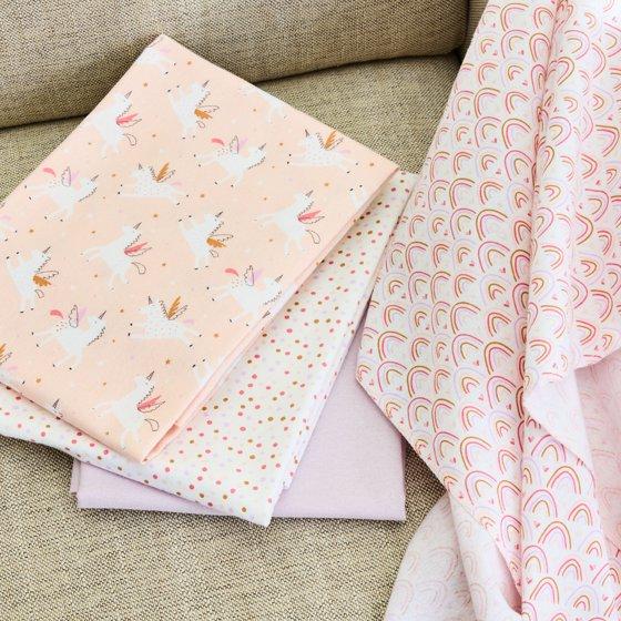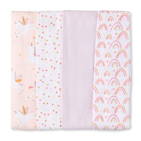 Cuddle your bundle of joy in the cozy, soft comfort of Parent's Choice 100% Cotton Flannel Receiving Blankets. This 4 pack of 30 inch x 30 inch receiving blankets feature adorable rainbow designs with coordinating patterns, perfect for baby girls. Made from breathable, lightweight cotton flannel, these blankets are great for swaddling, tummy time, or adding extra warmth in a stroller, car seat, or baby carrier. They’re also super handy during burp time or cleanup. The blankets can also be machine washed so they are easy to clean for continued use. Whether you're stocking up for your own bundle of joy or looking for a thoughtful baby shower gift, these rainbow themed receiving blankets deliver comfort, style, and everyday practicality.