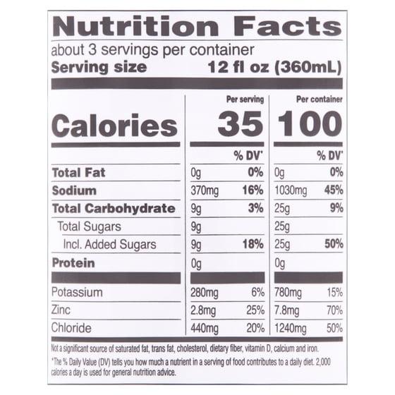 Water, Dextrose, Less Than 2% Of: Citric Acid, Potassium Citrate, Salt, Sodium Citrate, Natural Flavor, Stevia Leaf Extract, Zinc Gluconate And Vegetable Juice.