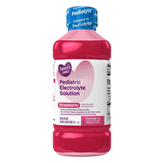 Parent's Choice Pediatric Electrolyte Solution restores electrolyte balance by quickly replenishing fluids, zinc and electrolytes for fast, effective rehydration. This electrolyte solution helps prevent mild to moderate dehydration in children and adults, and contains more electrolyte sodium compared to leading sports drinks, soda, 100 percent apple juice and water. It is formulated with prebiotics to help promote a healthy digestive system and features a natural strawberry flavor with other natural flavor that is great for both kids age 1+ and adults. This product does not contain artificial flavors, sweeteners or synthetic colors. Recommended by pediatricians and pharmacists, you can be sure you're giving your child the best with Parent's Choice Pediatric Electrolyte Solution. Comes in a 33.8 fl oz bottle.