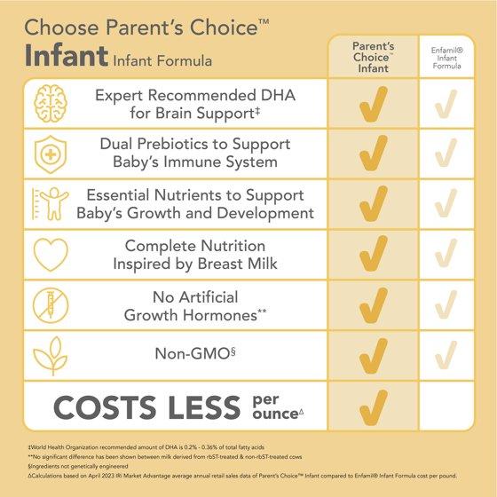 Compare to the nutrition of Enfamil Infant Formula. Inspired by breast milk, Parent's Choice Infant Formula Milk-Based Powder with Iron provides complete nutrition during baby's important first year. This easy to digest baby formula has been specially crafted to support baby's growth and development. Expert-recommended DHA for brain support. Dual prebiotics support baby's immune system. Non-GMO ingredients, ingredients not genetically engineered. No artificial growth hormones. No significant difference has been shown between milk derived from rbST-treated and non-rbST-treated cows. Certified Kosher by the Orthodox Union - OU-D. This product is not manufactured or distributed by the owner of the registered trademark Enfamil Infant Formula.