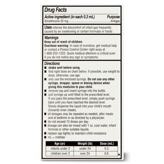 - Relieves the discomfort of infant gas frequently caused by air swallowing or certain formulas or foods