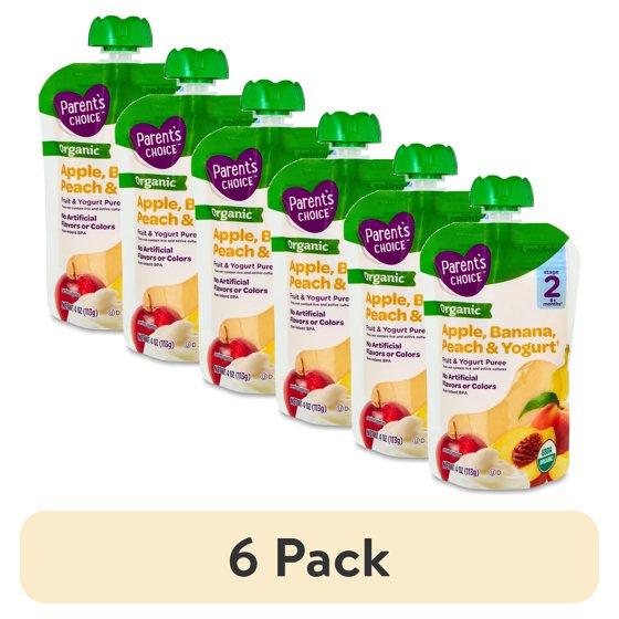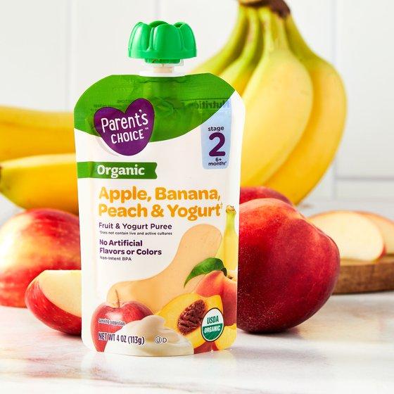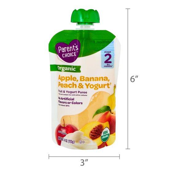(6 pack) Parent's Choice Organic Stage 2 Baby Food, Apple, Banana, and Peach Fruit and Yogurt Puree, 4 oz Pouch
