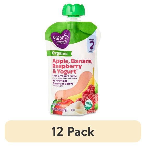 (12 pack) Parent's Choice Organic Stage 2 Baby Food, Apple, Banana, Raspberry Yogurt, 4 oz Pouch