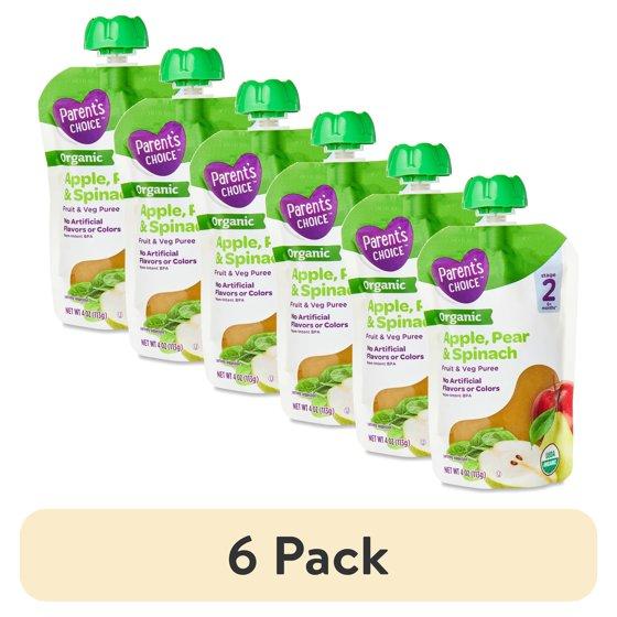 (6 pack) Parent's Choice Organic Stage 2 Baby Food, Apple Pear Spinach, 4 oz Pouch