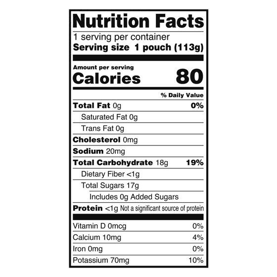 DO NOT MICROWAVE OR BOIL POUCH. DO NOT USE IF CAP SEAL IS BROKEN OR POUCH IS DAMAGED OR SWOLLEN. TO DECREASE THE RISK OF CHOKING: CHILDREN SHOULD BE SEATED UPRIGHT. DO NOT LEAVE CHILDREN UNATTENDED WHILE FEEDING. KEEP PLASTIC CAP AWAY FROM CHILDREN