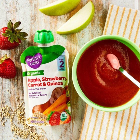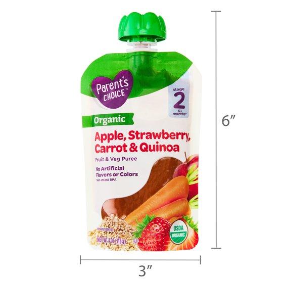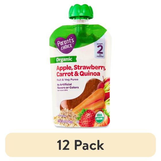 (12 pack) Parent's Choice Organic Stage 2 Baby Food, Apple, Strawberry, Carrot, and Quinoa Puree, 4 oz Pouch