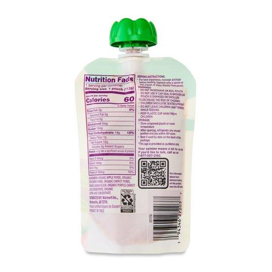 Be prepared wherever hunger strikes with a pouch of Parent's Choice Organic Stage 2 Baby Food Apple, Strawberry, Carrot, and Quinoa Puree. This nutritious puree contains no artificial flavors or colors, so you know you're giving your little one a snack you can feel good about. Plus, it comes in a convenient, resealable, BPA-free pouch that does not require refrigeration until you open it. The flexible packaging also makes it easy to stash several pouches in your bag as you're headed out the door. The pureed texture is ideal for introducing babies to new and different flavors. At any time of day, Parent's Choice Organic Stage 2 Apple, Strawberry, Carrot, and Quinoa Puree is a great choice for your little one.