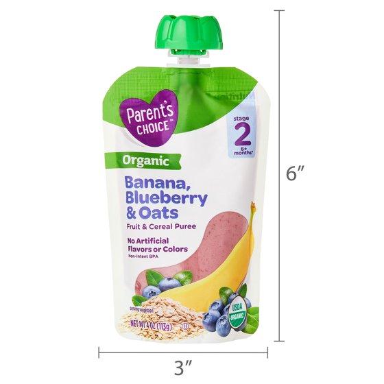 - Parent's Choice Organic Stage 2 Baby Food, Banana, Blueberry, and Oats Puree, 4 oz Pouch
