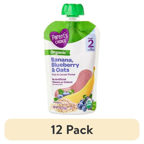 (12 pack) Parent's Choice Organic Stage 2 Baby Food, Banana, Blueberry, and Oats Puree, 4 oz Pouch