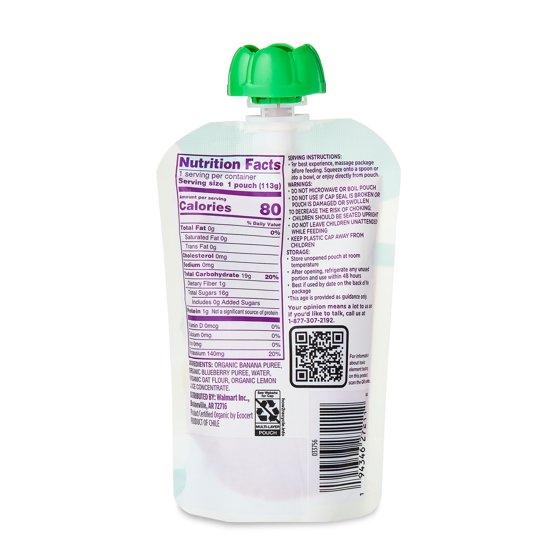 Be prepared wherever hunger strikes with a pouch of Parent's Choice Organic Stage 2 Baby Food Banana, Blueberry, and Oats Puree. This nutritious puree is made with real fruit and contains no artificial flavors or colors, so you know you're giving your little one a snack you can feel good about. Plus, it comes in a convenient, resealable, BPA-free pouch that does not require refrigeration until you open it. The flexible packaging also makes it easy to stash several pouches in your bag as you're headed out the door. The pureed texture is ideal for introducing babies to new and different flavors. At any time of day, Parent's Choice Organic Stage 2 Banana, Blueberry, and Oats Puree is a great choice for your little one.