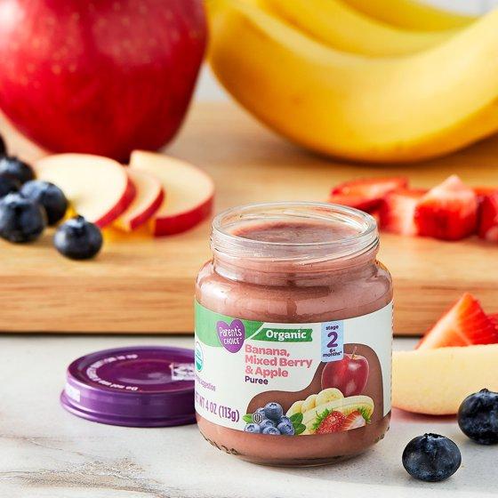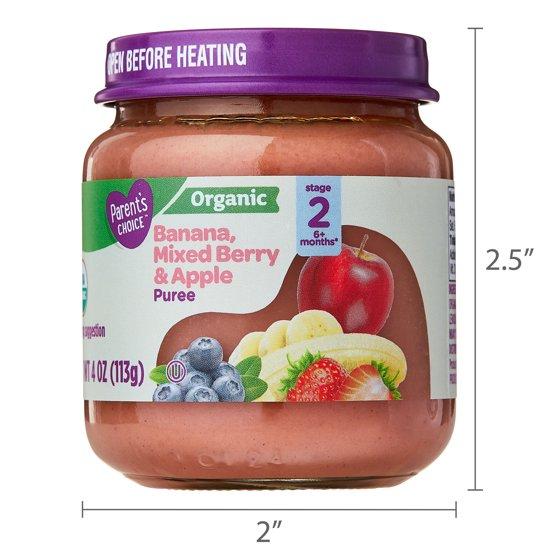- Parent's Choice Organic Stage 2 Baby Food, Banana, Mixed Berry, and Apple Puree, 4 oz Jar