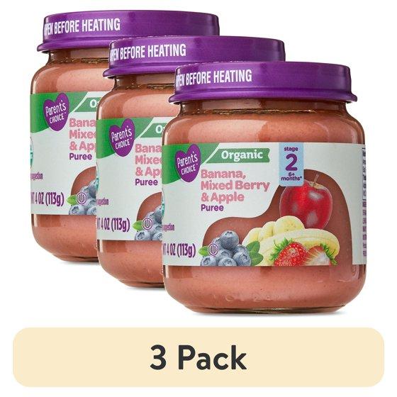 (3 pack) Parent's Choice Organic Stage 2 Baby Food, Banana, Mixed Berry, and Apple Puree, 4 oz Jar