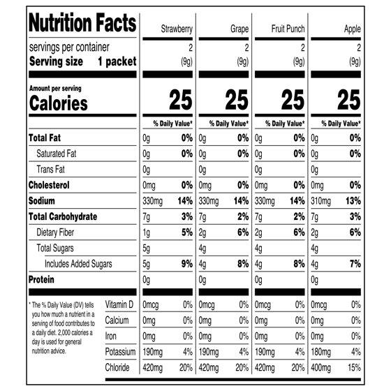 Strawberry - Anhydrous Dextrose, Short-Chain Fructooligosaccharides, Citric Acid, Salt, Tripotassium Citrate, Sodium Citrate, Contains less than 2% of Calcium Silicate, Stevia Leaf Extract, Natural Flavor, Colors (Black Carrot Extract, Beet Juice, Beta-Carotene) **Grape - Anhydrous Dextrose, Short-Chain Fructooligosaccharides, Citric Acid, Salt, Tripotassium Citrate, Sodium Citrate, Contains less than 2% of Malic Acid, Calcium Silicate, Stevia Leaf Extract, Natural Flavors, Colors (Vegetable Juice Concentrate, Spirulina Extract) **Fruit Punch - Anhydrous Dextrose, Short-Chain Fructooligosaccharides, Citric Acid, Salt, Tripotassium Citrate, Sodium Citrate, Contains less than 2% of Calcium Silicate, Stevia Leaf Extract, Natural Flavors, Colors (Beet Juice, Black Carrot Extract, Beta Carotene) **Apple - Anhydrous Dextrose, Short-Chain Fructooligosaccharides, Citric Acid, Salt, Tripotassium Citrate, Sodium Citrate, Contains less than 2% of Calcium Silicate, Stevia Leaf Extract, Colors (Apple Concentrate, Carrot Concentrate, Turmeric Oleoresin, Annatto Extract), Natural Flavors