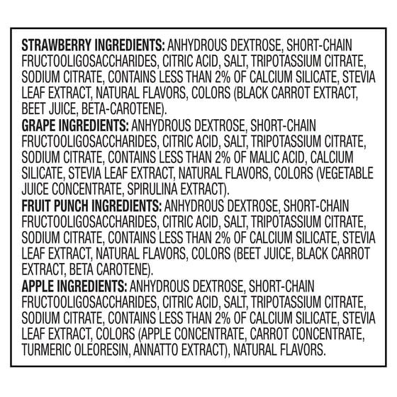 Strawberry - Anhydrous Dextrose, Short-Chain Fructooligosaccharides, Citric Acid, Salt, Tripotassium Citrate, Sodium Citrate, Contains less than 2% of Calcium Silicate, Stevia Leaf Extract, Natural Flavor, Colors (Black Carrot Extract, Beet Juice, Beta-Carotene) **Grape - Anhydrous Dextrose, Short-Chain Fructooligosaccharides, Citric Acid, Salt, Tripotassium Citrate, Sodium Citrate, Contains less than 2% of Malic Acid, Calcium Silicate, Stevia Leaf Extract, Natural Flavors, Colors (Vegetable Juice Concentrate, Spirulina Extract) **Fruit Punch - Anhydrous Dextrose, Short-Chain Fructooligosaccharides, Citric Acid, Salt, Tripotassium Citrate, Sodium Citrate, Contains less than 2% of Calcium Silicate, Stevia Leaf Extract, Natural Flavors, Colors (Beet Juice, Black Carrot Extract, Beta Carotene) **Apple - Anhydrous Dextrose, Short-Chain Fructooligosaccharides, Citric Acid, Salt, Tripotassium Citrate, Sodium Citrate, Contains less than 2% of Calcium Silicate, Stevia Leaf Extract, Colors (Apple Concentrate, Carrot Concentrate, Turmeric Oleoresin, Annatto Extract), Natural Flavors