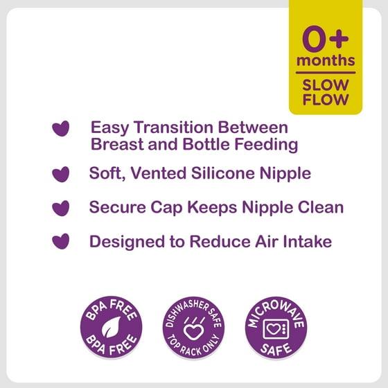 When transitioning from breastfeeding to bottle feeding, Parent's Choice 5 fl oz Slow Flow Wide Neck Bottles are ideal for your little one. Our wide-neck bottles feature a soft, vented silicone nipple shaped to mimic a breast to create a more natural feeding experience and ease the transition from breast to bottle. We have specially designed our bottles to provide a flow rate that is similar to breastfeeding, decreasing air intake, spit-up, burping, and gas. Parent's Choice 5 fl oz Slow Flow Wide Neck Bottles will make your baby's transition easier for them, and for you.