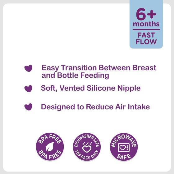 Parent's Choice Wide Neck Silicone Nipples, 6+ Months, Fast Flow, are a tool parents can count on to help ease the transition between breast and bottle feeding. The wide-neck, soft, vented, silicone nipples, are designed to reduce air intake which can help with pesky symptoms like indigestion. Parents will love that it's free from harmful like BPA and can be safely washed in the top rack of the dishwasher. These silicone nipples are also microwave-safe, making them a good time-saving option for busy parents who need to reheat bottles in a jiffy. With three nipples to a pack, you can always have a clean one on hand for a fast feeding. Intended for babies 6+ months of age, Parent's Choice Wide Neck Silicone Nipples, 6+ Months, Fast Flow, are a solid go-to nipple for bottle feeding your bundle of joy.