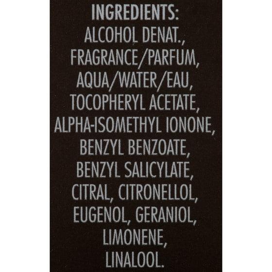 Alcohol, Parfum (Fragrance), Aqua (Water), Limonene, Ethylhexyl Methoxycinnamate, Diethylamino, Hydroxybenzoyl Hexylbenzoate, Citral, Cinnamal, Linalool, BHT