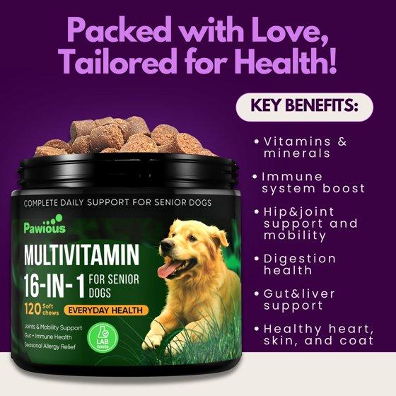 - Pawious 16-in-1 Dog Multivitamin Chewable with a comprehensive blend of essential nutrients, including Glucosamine, Omega-3 Salmon Oil, and 6 Probiotics, to provide all-encompassing support for your beloved pet.